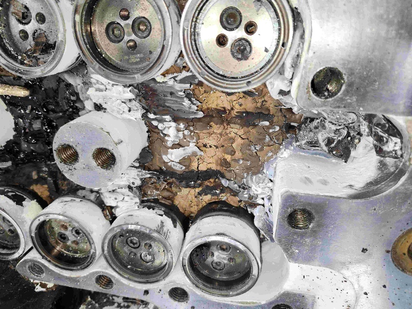 When I arrived, the hot runner was on the bench and open. After vacuuming out the white dust I found a lot of liquid resin had run down the manifolds from the weepage system. There was a large build up at the bottom of the pocket. I chipped out the degraded plastic and found fresh green plastic at the main/cross manifold interface. The cross manifold was removed from the hot runner and the leak was confirmed.